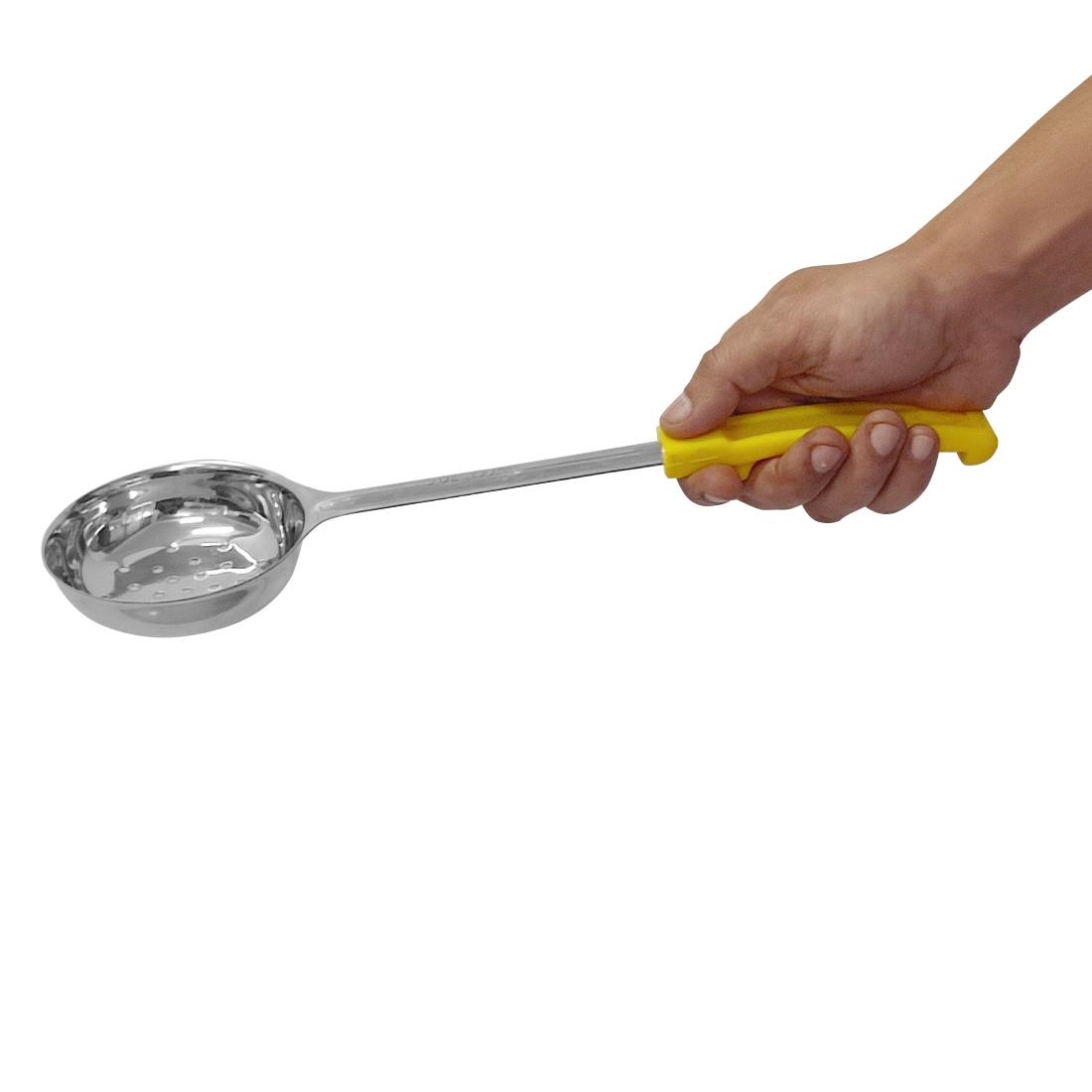 Accurately control your portion sizes with the 148ml Vogue perforated spoodle with yellow colour handle. Allowing you to scoop and serve with minimal effort, the Vogue spoodle helps you to limit waste while also helping you with food presentation. The perforated design of the head makes it easy to drain food before service, making it great for serving vegetables.
