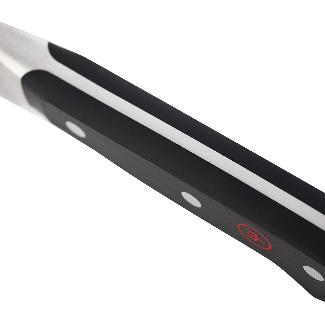 The full bolster (the junction between handle and blade) protects the hand from the sharp blade and balances the weight of the knife.