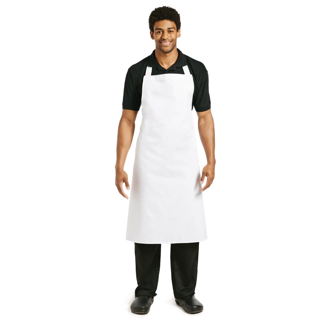 Traditional bib apron in a white finish with sewn in ties and brass eyelets, ideal for front or back of house use.