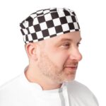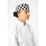 The Whites Chefs Skull Cap Big Black and White Check is made from lightweight polycotton to help keep chefs cool and features a classic big black and white checkered skull cap, perfect for use in kitchens.