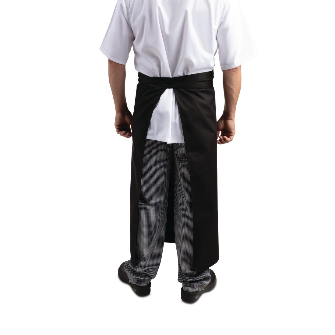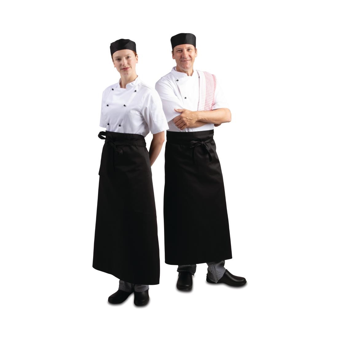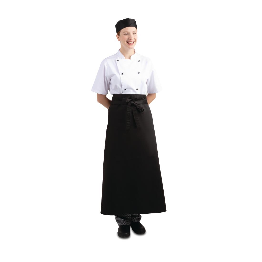 Hardwearing polycotton long black bistro waist apron with matching sewn in ties. This is the ideal simple apron for any waiter or waitress.