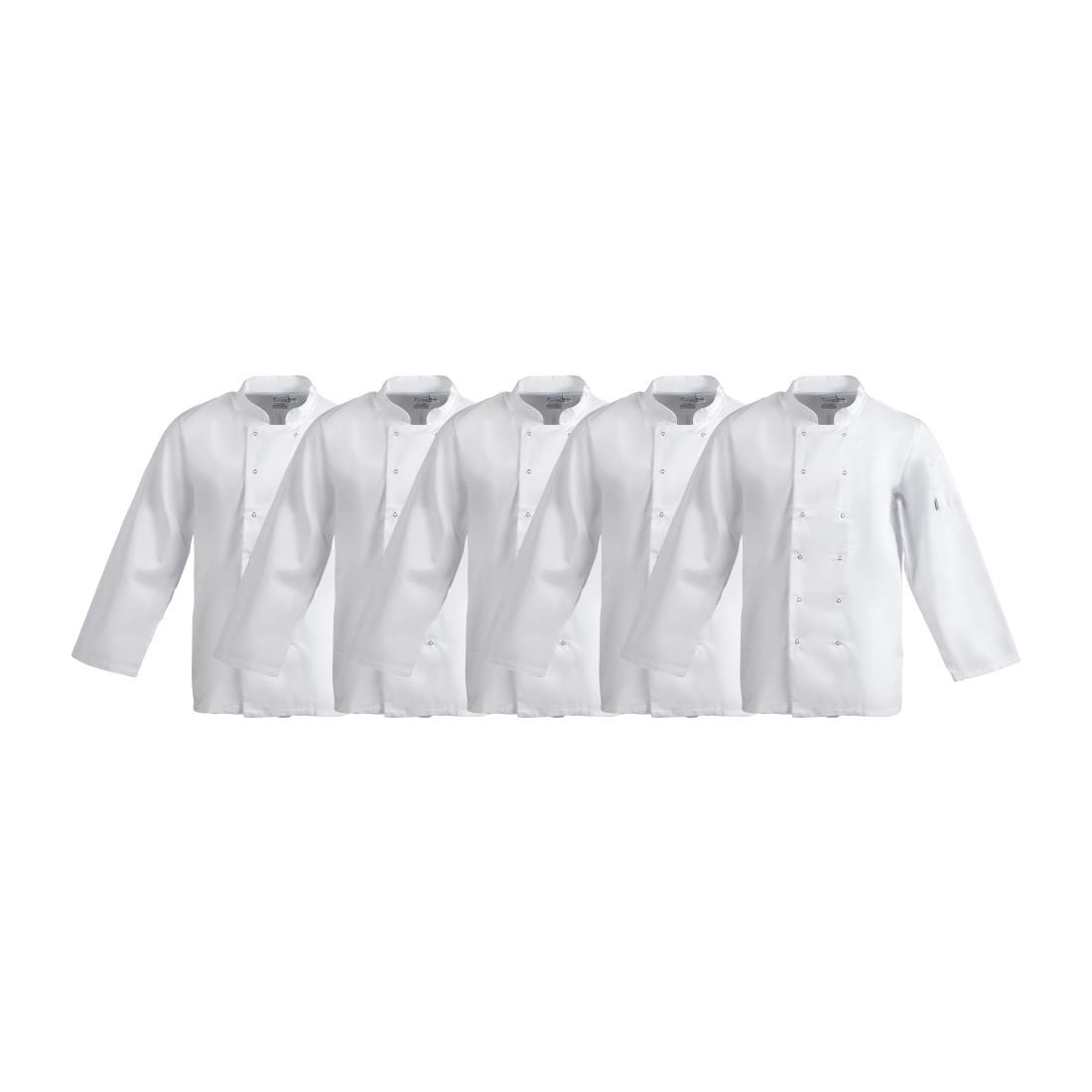 Long sleeves provide essential protection for arms and torso when working with hot equipment and surfaces, whilst the classic white finish offers a smart, professional appearance that reflects heat effectively. Double-stitched seams reduce the risk of tears during intensive use, and stainless steel press stud fastenings ensure a secure, comfortable fit throughout long shifts.