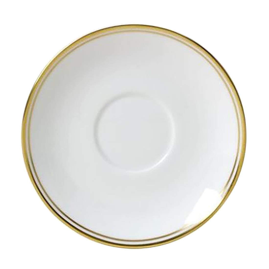 Bring understated elegance to your table settings with this pack of 12 espresso saucers from the William Edwards Burnished Gold collection. Produced in England, each piece features a hand-burnished 24-carat gold edging that is not only decorative but also strategically positioned to resist wear, seamlessly marrying form with function.