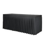 Pick a stylish and practical option for your tables, with this ZOWN black Paramount cover for the XL150 table. The long pleated sides of this Paramount table cover offer a high level of style and class for your venue that will delight and impress your guests. Adding covers to your tables is a simple way of enhancing your venue’s ambience, and classy events like graduations and banquets require as much style in as many ways as possible. Not just for style however, a cover can help protect against the stains and scratches that can so often be the bane of commercial tables. A resistance to creases saves time on ironing, and a 100% polyester construction gives the cover even more resistance against rips and tears and also offers quicker drying.ZOWN’s table covers are a brilliant choice for any commercial venue.